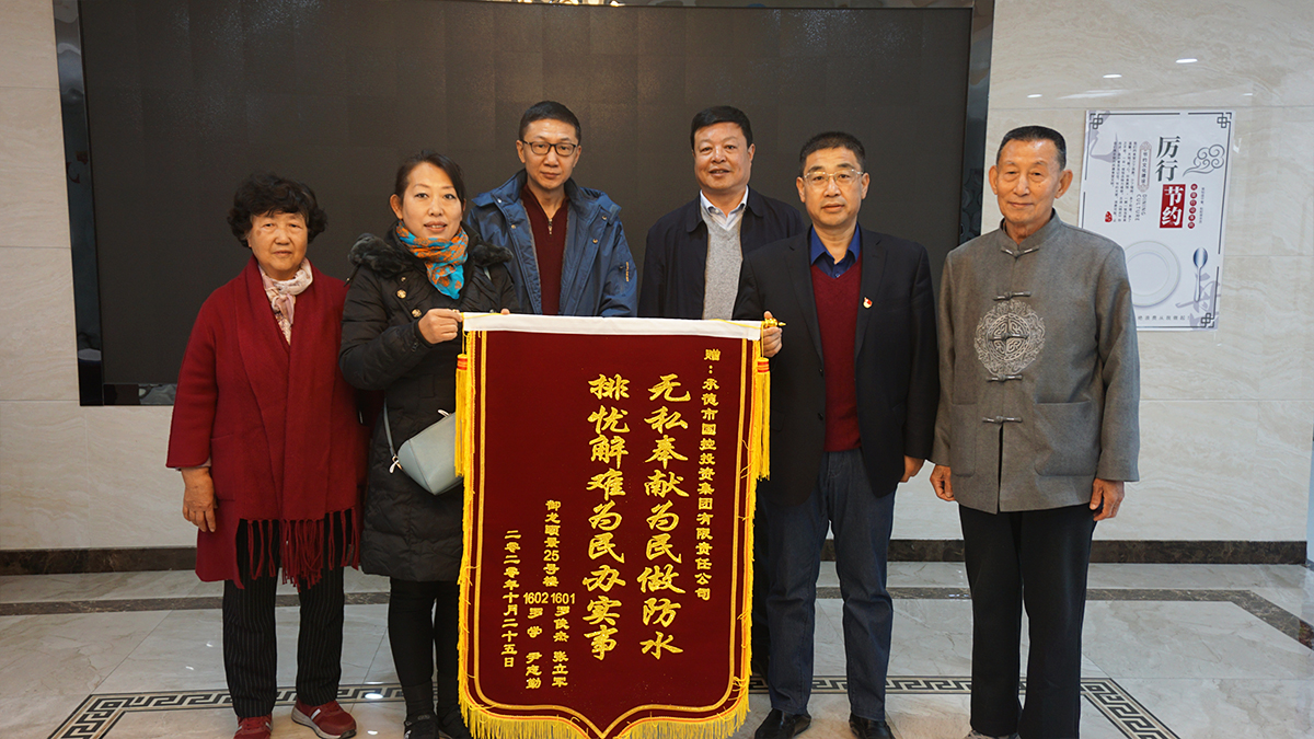 10月28日上午,市區(qū)御龍頤景小區(qū)的四位居民將一面繡有“無私奉獻(xiàn)為民做防水,排憂解難為民辦實(shí)事”的錦旗送到集團(tuán)公司,表達(dá)了對集團(tuán)公司出資解決御龍御景小區(qū)房屋漏水問題的感謝之情。
